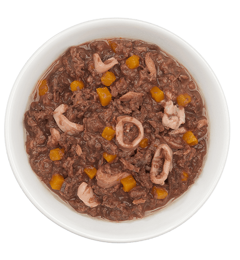 Flaked tuna with pumpkin and indulgent calamari in a savory tuna broth
