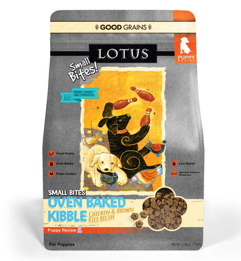 Your puppy’s ability to grow healthy and strong starts with his nutrition, so feed him Lotus Oven-Baked Chicken Small Bites Recipe! This oven-baked kibble for puppies combines real chicken, chicken liver, brown rice and recognizable fruits and vegetables into bite-sized pieces. The beneficial blend of olive and salmon oils provides your pup with healthy omega fatty acids, while vitamins, antioxidants and nutrients help support his overall health. Plus, this kibble tastes just like an oven-baked chicken cookie that your canine companion won’t be able to resist