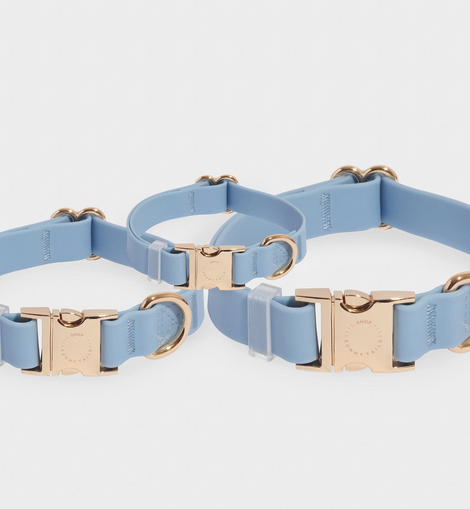 Explore our lightweight, buttery soft, odor resistant, all-weatherproof Cloud Dog Collar we developed using 100% vegan PVC coated webbing that’s been tested to withstand approximately 750 lbs of pull. Collars are finished with luxe light gold rust-resistant quick release buckle. Please measure your pup's neck to ensure the right fit. Available in 3 sizes and pair this leash with our matching waste bag holder and waterproof Cloud Leash.  Hardware: Made with light gold rust-resistant zinc alloy and strength tested to withstand up to 450+ of lbs. Can't decide? Save 10% on any 3+ items with code BUNDLE10 or save 15% on any 5 items with code BUNDLE15. Be Part of Our Community We love seeing your pet in our products!
