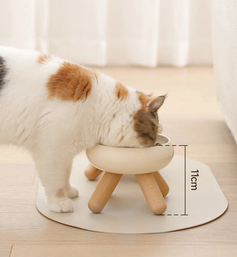 Pet bowls high enough and the cats don’t need to bend their heads too much to feed, prevents vomiting. Especially better for elder cats’ digestion. The wood stand on the bowls stopping the bowls from sliding around, and they can nudge the food around without the bowls being pushed on to the floor.