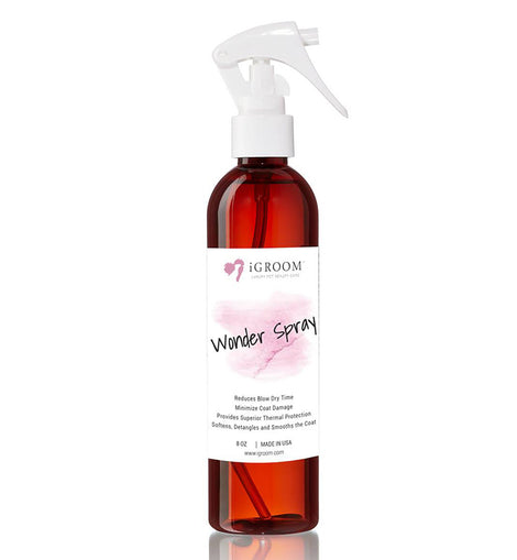 iGroom Wonder Spray works wonders at reducing drying time! Thermal protection and humidity resistance benefits within this multifunctional spray improve the coat and keep it looking Wonder-ful! Helps to smooth and detangle the coat.