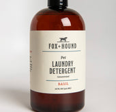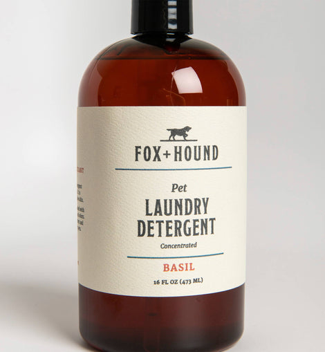 Fox + Hounds Basil Natural Pet Laundry Detergent is a clean, natural HE detergent. Featured On Martha Stewart Living Even if you bathe them regularly, it's healthier for your pet and your home to launder their sleeping area, too. Traditional laundry detergents can be toxic to your pet — especially if your pup chews on their blankets, bedding, or toys. This is why we spent two years working with a chemist to develop a clean, natural solution. Our formula is an HE detergent, so while it’s good for your pet, it’s good for your appliances, too. The 16 oz. bottle with a no-mess pump, good for 16 loads of pet laundry. Comes in a sweet basil scent, which also acts as a natural insect repellent.