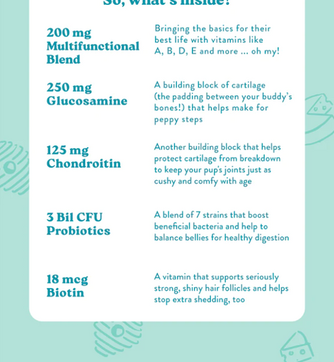 Let’s help keep your pup feeling “not a day over 1”! A daily supplement to support overall pup-wellness – from healthy skin and a shiny coat, to a happy tummy, to strong joints – this tasty chew has it all. Oh… and did we mention our immune-supporting, essential vitamin blend? (Yup, we added that, too!)