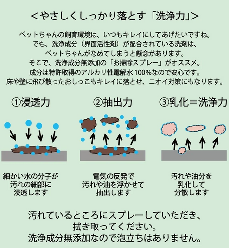 Cleaning hard-to-wash spots like cages and toilets becomes easy by simply spraying and wiping. No surfactants are used, so there is no foaming. It can also be used on toys pets put in their mouths, as well as food and water bowls.