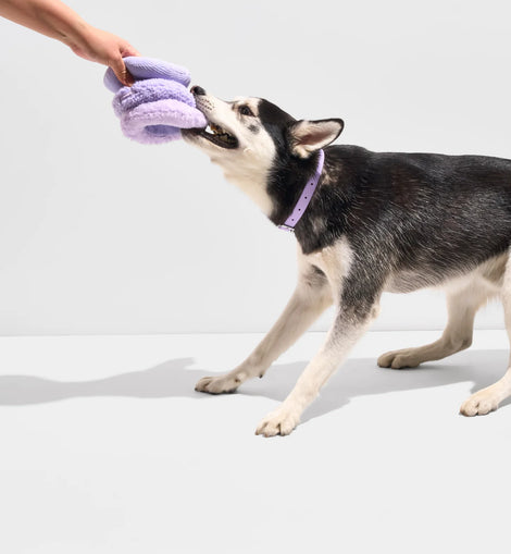 A puzzle toy packed with sounds, textures, and reward keep your pup busy and captivated. Features a hidden tennis ball inside a tri-stack of sherpa, corduroy, and fluff textures, with crinkle, high and low squeak sounds.